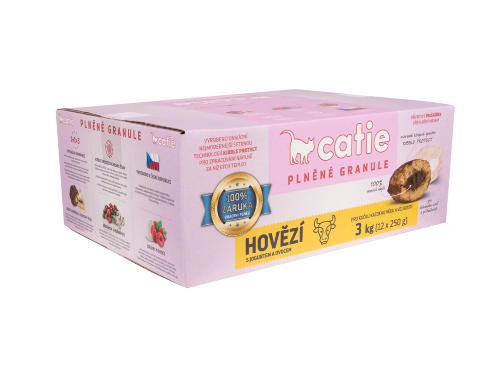 Pro plněné granule CATIE je typická chutnost a mimořádně vysoká využitelnost i kompletnost živin. Základem jsou vybrané kvalitní suroviny, převážně živočišné. Unikátní je zpracování technologií KIBBLE PROTECT do třívrstvého polštářku. Hlavní součást granule (66%) je masová náplň zpracovaná za nižších teplot, aby se horkem nenarušila hodnota a využitelnost živin. Maso je ochráněno dobře propečenou křupavou vrstvou a opatřeno vrchní vrstvičkou s bylinkami. KIBBLE PROTECT – ochrana živin.