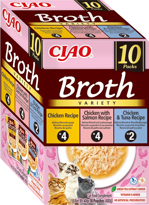 CIAO BROTH Multipack obsahuje 10 kapsiček natrhaného kuřecího masa v lahodném kuřecím vývaru. Pečlivě vybrané suroviny a přísně kontrolovaná čerstvost. Vaše kočka si bude užívat lákavé aroma a neodolatelnou chuť při každém otevření kapsičky! Vyrobeno ze 100% čistého kuřecího prsa. Žádné obiloviny, konzervanty ani umělá barviva. Vysoký obsah vody, který je prospěšný pro celkové zdraví koček. Nízký obsah kalorií.