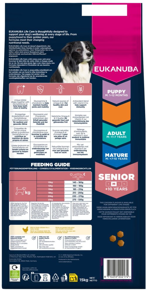 Jedinečné šestihranné granule EUKANUBA v kombinaci se systémem dentální péče DentaDefense navíc udržují zuby dlouhodobě čisté a zdravé. Toto 100% kompletní a vyvážené krmivo poskytuje pokročilou výživu na podporu optimální tělesné kondice a celoživotní pohody psích seniorů středně velkých plemen. Zvolte krmivo EUKANUBA a poskytněte svému psovi kvalitní výživu přizpůsobenou každé fázi jeho života.