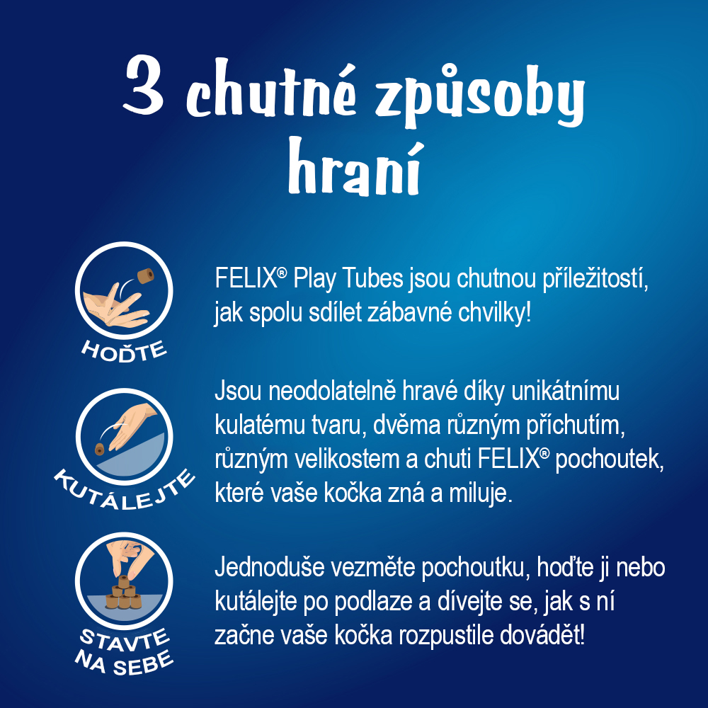 Nové FELIX® Play Tubes jsou chutnou příležitostí, jak spolu sdílet zábavné chvilky! Jsou neodolatelně hravé díky unikátnímu kulatému tvaru, dvěma různým příchutím, různým velikostem a chuti FELIX® pochoutek, které vaše kočka zná a miluje. Jednoduše vezměte pochoutku, hoďte ji nebo kutálejte po podlaze a dívejte se, jak s ní začne vaše kočka rozpustile dovádět!