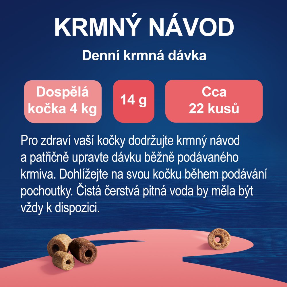 Denní krmná dávka pro dospělou kočku 4 kg: 14 g nebo přibližně 23 kousků. Čistá čerstvá pitná voda by měla být vždy k dispozici. Pro zdraví vaší kočky dodržujte krmný návod a patřičně upravte dávku běžně podávaného krmiva.