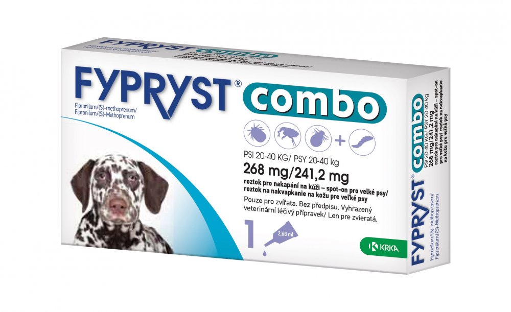 Fypryst combo pro psy je přípravek určený k léčbě a prevenci napadení blechami (Ctenocephalides felis.), klíšťaty (Ixodes ricinus, Dermacentor variabilis, Dermacentor reticulatus, Rhipicephalus sanguineus) a všenkami (Trichodectes canis) u psů o hmotnosti 20-40 kg.