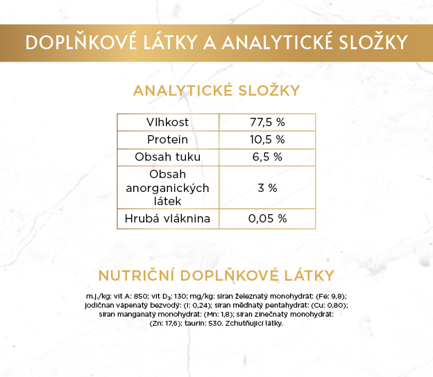 Nutriční doplňkové látky: m.j./kg: vit A: 850 vit D3: 130 mg/kg: síran železnatý monohydrát: (Fe): 9,8 jodičnan vápenatý bezvodý: (I): 0,24 síran měďnatý pentahydrát: (Cu): 0,80 síran manganatý monohydrát: (Mn): 1,8 síran zinečnatý monohydrát: (Zn): 17,6 taurin: 530 Zchutňující látky.