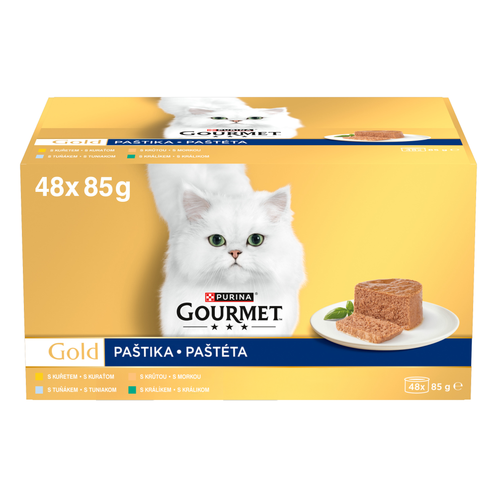 GOURMET™ Gold paštiky: Jemné paštiky s hovězím, kuřetem, lososem a dalšími vynikajícími příchutěmi, pečlivě připravené tak, aby nabídly vaší kočce požitek z delikátní a jemné textury. Všechna krmiva GOURMET™ Gold jsou vyrobena z vysoce kvalitních surovin a jsou bez přidaných barviv a umělých konzervantů.