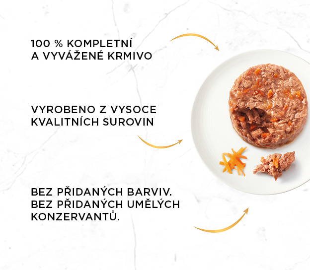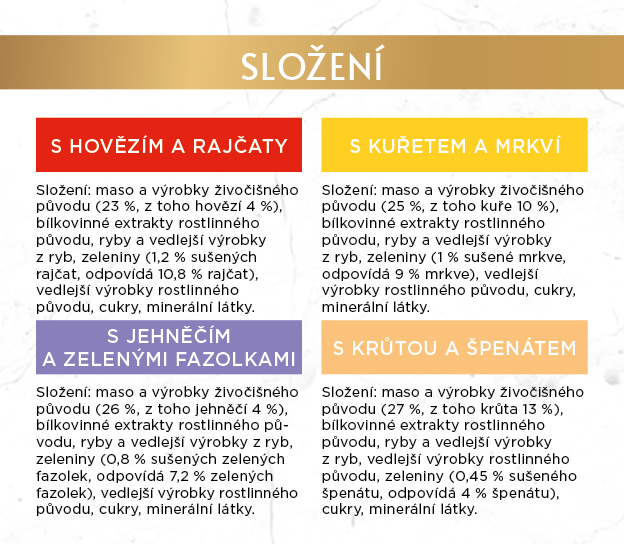 S kuřetem a mrkví: maso a výrobky živočišného původu (25 %, z toho kuře 10 %), bílkovinné extrakty rostlinného původu, ryby a vedlejší výrobky z ryb, zeleniny (1 % sušené mrkve, odpovídá 9 % mrkve), vedlejší výrobky rostlinného původu, cukry, minerální látky