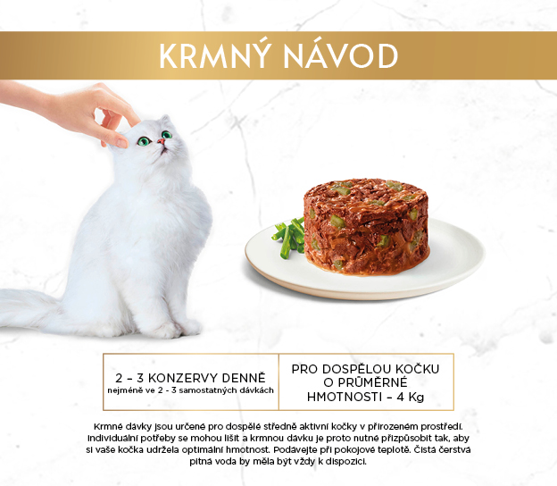Dospělou kočku o průměrné hmotnosti (4 kg) krmte 2-3 konzervami denně, nejméně ve 2-3 samostatných dávkách. Krmné dávky jsou určené pro dospělé středně aktivní kočky v přirozeném prostředí. Individuální potřeby se mohou lišit a krmnou dávku je proto nutné přizpůsobit tak, aby si vaše kočka udržela optimální hmotnost. Podávejte při pokojové teplotě. Čistá čerstvá pitná voda by měla být vždy k dispozici.