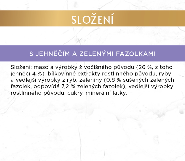 Maso a výrobky živočišného původu (26 %, z toho jehněčí 4 %), bílkovinné extrakty rostlinného původu, ryby a vedlejší výrobky z ryb, zeleniny (0,8 % sušených zelených fazolek, odpovídá 7,2 % zelených fazolek), vedlejší výrobky rostlinného původu, cukry, minerální látky.
