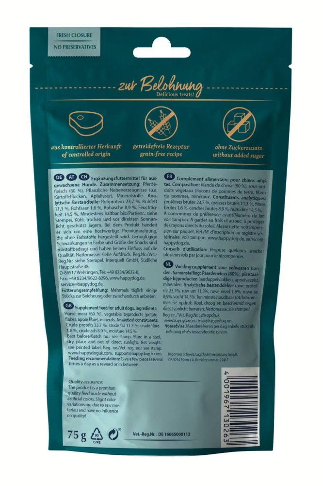 Jedná se o vysoce kvalitní Premium krmivo vyráběné bez použití barviv. Nepatrné přirozené kolísání barvy a velikosti pamlsků je podmíněné surovinou a nemá žádný vliv na kvalitu!