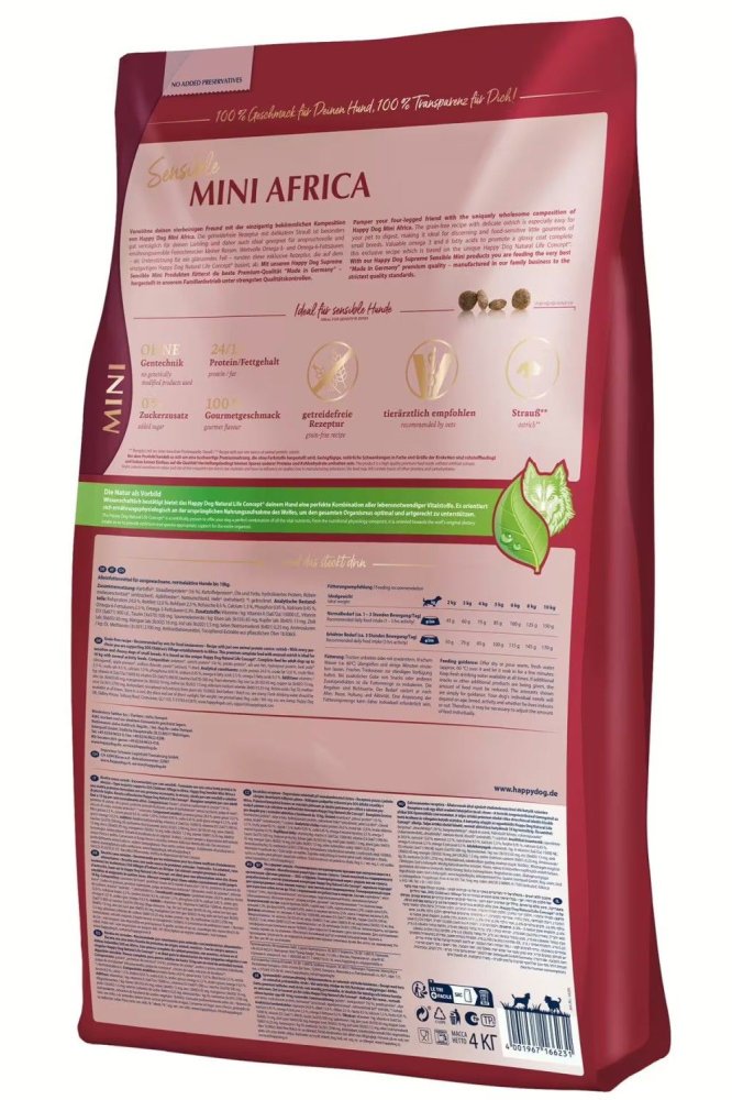 Exotický pštros jako jediný zdroj živočišných bílkovin a bezlepkové brambory jsou v tomto případě obzvláště vhodné a zamilují si ho i ti nejcitlivější labužníci. Brambory neobsahují lepek a jsou doporučeny pro psy s intolerancí obilovin. Pštros jako vzácný a exkluzivní zdroj bílkovin se vyznačuje optimální snášenlivostí. Tuto exkluzivní recepturu završují cenné omega-3 a omega-6 mastné kyseliny, které jsou důležité pro zdravou kůži a lesklou srst. Díky tomu je naše specialita Happy Dog Sensible Mini Africa vyváženým a ideálním suchým krmivem pro malé psy s alergiemi a potravními intolerancemi.