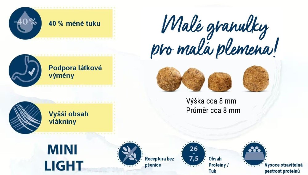 Lehké, dietní. Vynikající superprémiové granule pro dospělé psy malých plemen do 10 kg v dospělosti. Toto speciální nízkotučné a sytící krmivo je vhodné zejména pro pejsky s nadváhou nebo k udržení hmotnosti (např. po dietě). Receptura má cíleně snížený obsah energie, přináší pět zdrojů živočišných proteinů a přídavek mořských mušlí na podporu kloubů. Velikost granulí je přizpůsobena malému chrupu malých psů. Superprémiová kvalita, bez pšenice, bez sóji, bez umělých barviv, vůní a konzervantů, bez geneticky modifikovaných surovin. Vynikající chutnost a snášenlivost. 26 % proteinů a 7,5 % tuku.