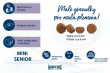 Pro starší psy. Vynikající superprémiové granule pro starší psy malých plemen do 10 kg v dospělosti. Tyto plnohodnotné granule jsou vhodnou vyváženou potravou pro starší pejsky s normální denní aktivitou. Speciální šetrné složení krmiva zatěžuje organismus jen minimálně. Lehce stravitelné krmivo má optimální obsah bílkovin, střídmý obsah energie a snížený obsah fosforu a sodíku. Přináší pět zdrojů živočišných proteinů a přídavek mořských mušlí (Slávka pyskatá) na podporu kloubů. Velikost granulí je přizpůsobena malému chrupu malých psů. Superprémiová kvalita, bez pšenice, bez sóji, bez umělých barviv, vůní a konzervantů, bez geneticky modifikovaných surovin. Vynikající chutnost a snášenlivost. 23,5 % proteinů a 11 % tuku.