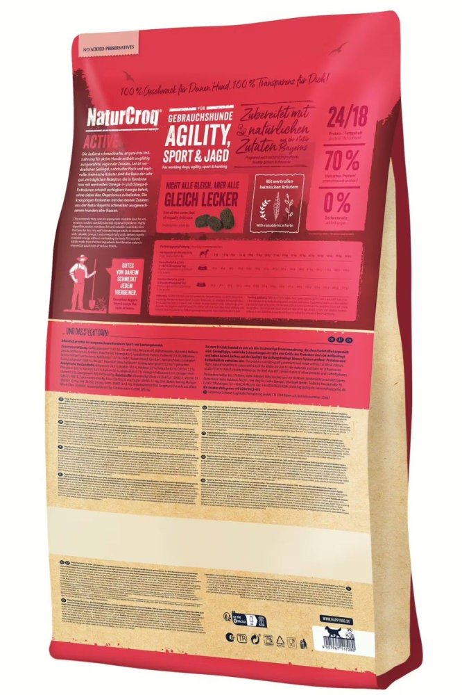 A je také vhodnou výživou pro březí a kojící feny. Nabízí 70 % živočišných proteinů (z celkového obsahu proteinů) a vyváženou skladbu kvalitních stavebních bílkovin z drůbeže, hovězího a ryb. Cenné omega-3 a omega-6 mastné kyseliny ze slunečnicového a řepkového oleje poskytují rychle dostupnou energii bez zatěžování organismu. Celozrnné obiloviny jsou důležitým zdrojem vlákniny, mechanicky povzbuzují střevní činnost a tím pomáhají podporovat zdraví střev. Poskytují také mnoho vitamínů skupiny B, minerální látky jako je hořčík, železo, selen a zinek a jsou plné komplexních sacharidů. Mimořádně chutná receptura obsahuje i cenné místní bylinky, které podporují trávení a novozélandské mořské mušle (Slávka pyskatá) na podporu kloubů. Krmivo Happy Dog NaturCroq Active je proto ideálním krmivem pro všechny dospělé psy se zvýšenou potřebou energie a proteinů, které podporuje jejich optimální vytrvalost a kondici.