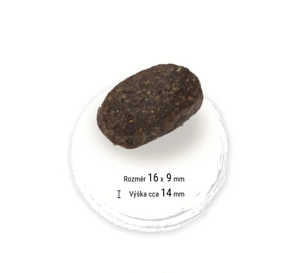 Drůbeží masová moučka (12%), celozrnná pšenice, pšeničná mouka, kukuřičná mouka, drůbeží tuk, celozrnná kukuřice, celozrnný ječmen, hovězí lůj, hovězí škvarky, hemoglobin (sušený), hovězí masová moučka, rybí moučka (1,5%), játrový hydrolyzát, cukrovarské řízky, slunečnicový olej (0,8%), jablečná matolina (sušená) (0,8%), droždí (sušené), sladový květ, řepkový olej (0,2%), chlorid sodný, zelený oves (sušený), slunečnice (sušená), řeřicha (sušená), petržel (sušená), mořské mušle (sušené), (byliny celkem: 0,3%).
