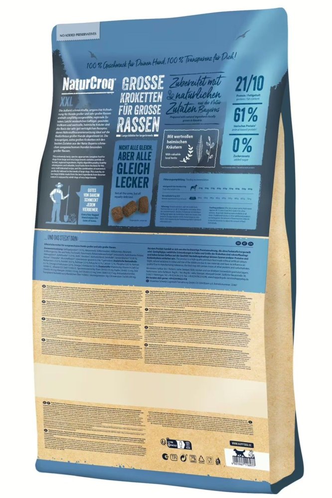 Extra velké granule přináší 61 % živočišných proteinů (z celkového obsahu proteinů) a cenné zdroje vysoce kvalitních bílkovin z lahodné drůbeže, ryb a hovězího masa. Tyto velmi chutné granule obsahují zdravé regionální celozrnné obiloviny (ječmen, kukuřice, pšenice). Drůbeží maso poskytuje vašemu velkému psovi vysoce kvalitní živočišné bílkoviny a poskytuje mu potřebnou energii. Celozrnné obiloviny dodávají velice potřebnou vlákninu, která reguluje střevní činnost, zasytí a podporuje zdravé trávení. Šetrně zpracované celozrnné obilí poskytuje také mnoho vitamínů B, minerálních látek jako je hořčík, železo, selen a zinek a jsou plné komplexních sacharidů. Mimořádně chutná receptura obsahuje i cenné místní bylinky, které podporují trávení a celkové zdraví a také novozélandské mořské mušle (Slávka pyskatá) na podporu kloubů. Velikost granulí NaturCroq XXL byla speciálně přizpůsobena pro velká plemena psů, aby se zabránilo kvapnému polykání krmiva bez rozkousání. Obsah živin je optimálně přizpůsoben energetickým potřebám velkých plemen psů. Toto 100 % vyvážené, chutné psí krmivo je ideální pro dospělé, normálně aktivní psy velkých a obřích plemen.