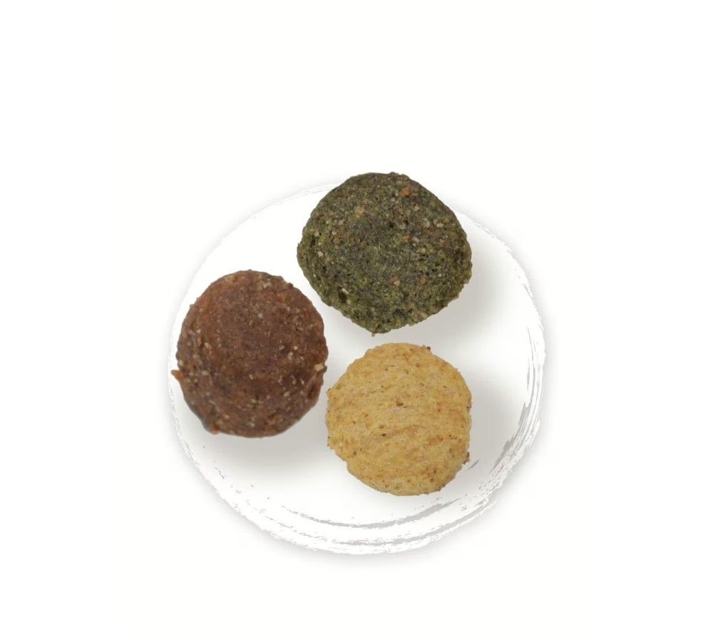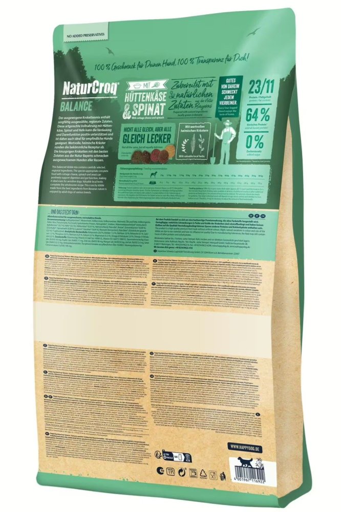 Drůbeží protein*, pšeničná mouka, celozrnná kukuřice, celozrnná pšenice, kukuřičná mouka, ovesná mouka, celozrnný ječmen, rýžová mouka, drůbeží tuk, masová moučka, hovězí lůj, rybí moučka, játrový hydrolyzát, hemoglobin*, škvarky, cukrovkové řízky* (odcukřené), jablečná dřeň* (0,6%), droždí* (0,4%), tvaroh* (0,3%), chlorid sodný, špenátová mouka (0,08%), vojtěška* (0,08%), zelený oves*, slunečnice*, řeřicha*, petržel*, mrkev* (0,04%), červená řepa*, rýžová mouka (fermentovaná), (zelené byliny celkem: 0,3%); *) sušené. Stravitelná energie: 1.620 KJ/100g; 3.870 Kcal/kg