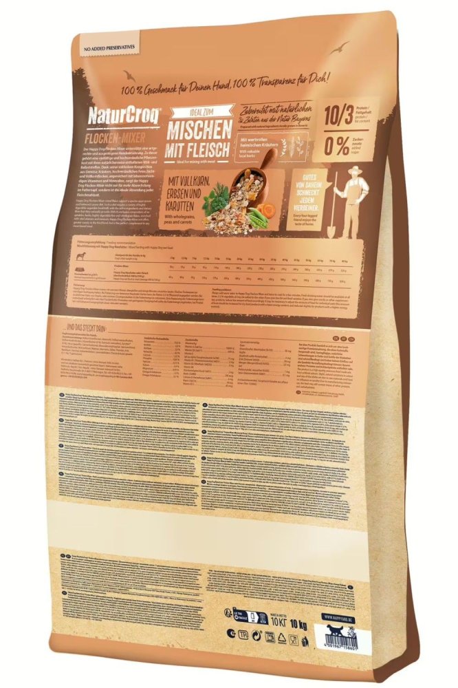 Doplňkové krmivo Happy Dog NaturCroq Flocken-Mixer obsahuje vysoce stravitelné šupinaté vločky, celozrnné vločky, zeleninu a bylinky a je obohaceno o všechny nezbytné vitamíny a minerály. Mrkev a hrášek poskytují důležitou vlákninu a obsahují také karoten a rostlinné bílkoviny. Náš příkrm NaturCroq Flocken-Mixer nabízí perfektní doplněk k jakémukoli masovému pokrmu a zajišťuje psům druhově vhodnou a vyváženou potravu s masem.
