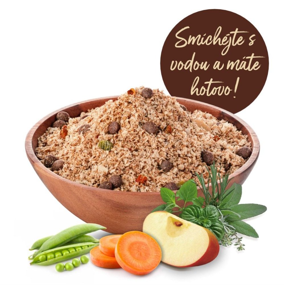 Kukuřičná mouka (válcově sušená), škvarky, pšeničná mouka, pšenice, drůbeží tuk, hrachové vločky, mrkev*, drůbeží protein*, hovězí tuk, uhličitan vápenatý, hemoglobin, rybí moučka, játrový hydrolyzát, monokalciumfosfát, cukrovkové řízky* (odcukřené), chlorid sodný, jablečná dřeň*, chlorid draselný, plod černého bezu, saturejka, majoránka, rozmarýn, šalvěj, tymián, anýz, bazalka, fenykl, květ černého bezu, květ levandule; (sušené bylinky celkem: 0,11 %); *) sušené.