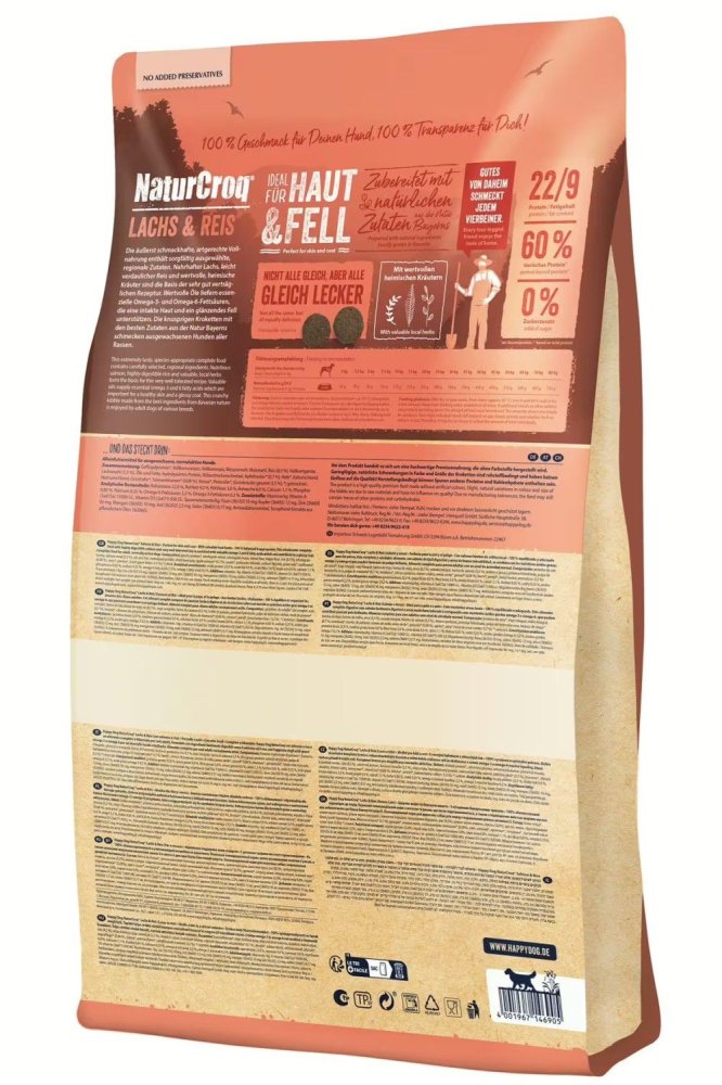 Přináší 60 % živočišných proteinů (z celkového obsahu proteinů) a cenný zdroj vysoce kvalitních bílkovin z lehce stravitelného drůbežího masa a vydatného lososa. Lahodné granule obsahují také lehce stravitelnou rýži a samozřejmě také zdravé regionální celozrnné obiloviny (ječmen, kukuřice, pšenice). Losos je bohatý na esenciální omega-3 a omega-6 mastné kyseliny, které zajišťují neporušenou kůži a lesklou srst. Celozrnné obiloviny dodávají tělu důležitou vlákninu, která reguluje střevní činnost, zasytí a podporuje zdravé trávení. Šetrně zpracované celozrnné obilí poskytuje také mnoho vitamínů B, minerálních látek jako je hořčík, železo, selen a zinek a jsou plné komplexních sacharidů. Jedinečně lahodná receptura je vylepšena o cenné místní bylinky, které poskytují vašemu čtyřnohému příteli mnoho cenných přírodních živin pro imunitu a celkové zdraví. Toto vyvážené, chutné krmivo pro psy je ideální pro dospělé, normálně aktivní psy všech plemen, kteří jsou náchylní k citlivé kůži a problémům se srstí, protože krmiva s lehce stravitelným lososem, drůbeží a rýží se u těchto problémových psů dobře osvědčily.