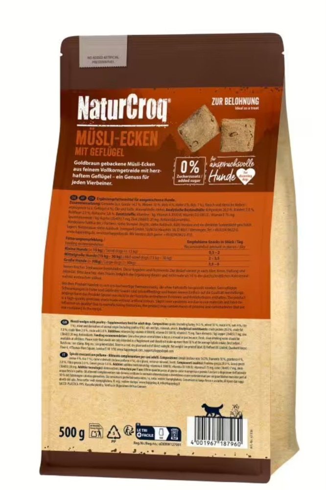 Zlatavě hnědé pečené psí sušenky - pamlsek pro každého čtyřnohého přítele. Rostlinná vláknina, kterou obsahují, také zajišťuje snadnou stravitelnost. Naše čtvercové psí sušenky jsou přirozeně upečené do křupava bez umělých barviv a konzervantů a bez přidaného cukru. Čtvercové sušenky NaturCroq s drůbežím masem jsou ideální pro střední a velké psy. Jsou opravdovou pochoutkou, ohromí svou lahodnou chutí a křupavou texturou a jsou ideální pro malé chvilky rozmazlování.