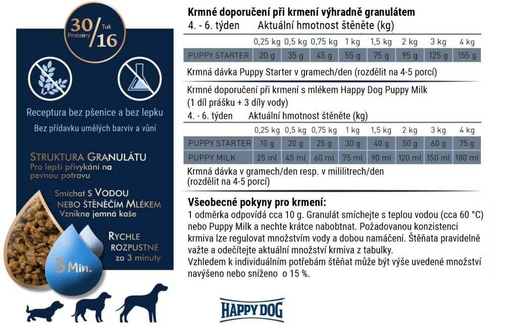 Optimálně složené krmivo pro štěňata je tím nejlepším základem pro jejich zdravý vývoj. Zejména ve fázi odstavu a při navykání na pevnou potravu je důležité dbát na to, aby potravu štěňata velmi dobře snášela. Naše granulované krmivo Happy Dog Sensible Puppy Starter Lamm & Reis proto obsahuje velmi dobře snášenlivé jehněčí maso a vysoce stravitelnou rýži. Receptura bez drůbeže je vhodná zejména pro psy s citlivým žaludkem a je optimálně přizpůsobena vysokým nárokům citlivých štěňat. Díky přídavku Happy Dog Natural Life Concept ® je štěňatům poskytnuto vše, z čeho jejich organismus holisticky profituje a co jim umožňuje bez obav nastartovat dlouhý a zdravý psí život.