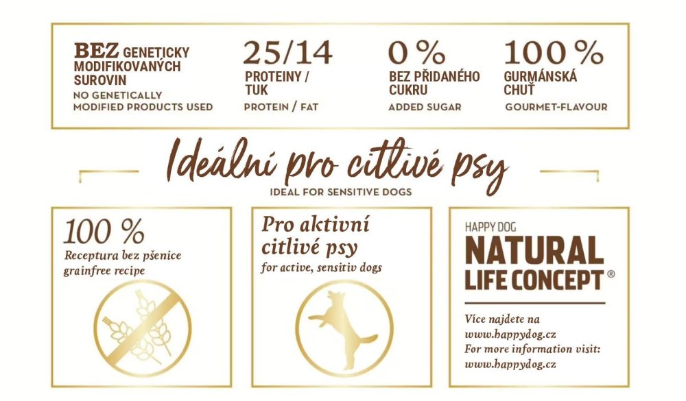 Připravte svému náročnému gurmánovi opravdovou lahůdku s vynikající recepturou z jemného lososa, lahodného králíka a výživného jehněčího masa, zjemněnou bezlepkovými bramborami. Vydatné granule s rybou obsahují lososa, který je bohatý na esenciální omega-3 a omega-6 mastné kyseliny, zatímco králík poskytuje biologicky cenné lehce stravitelné bílkoviny a jehněčí maso zase mnoho důležitých minerálních látek. Díky přídavku jedinečného Happy Dog Natural Life Concept® obsažené novozélandské mušle podporují klouby a cenné omega-3 a omega-6 mastné kyseliny ze slunečnicového a řepkového oleje zajišťují lesklou srst.
