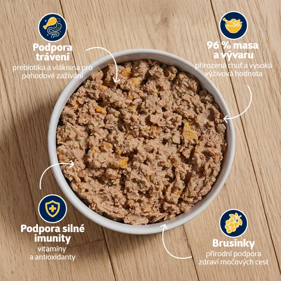 Dopřejte svému chlupáči prémiové kachní maso s 96 % masa a vývaru. Kachní maso je bohaté na nenasycené mastné kyseliny a brusinky se starají o zdraví močových cest. Kompletní a vyvážená výživa pro každý den.