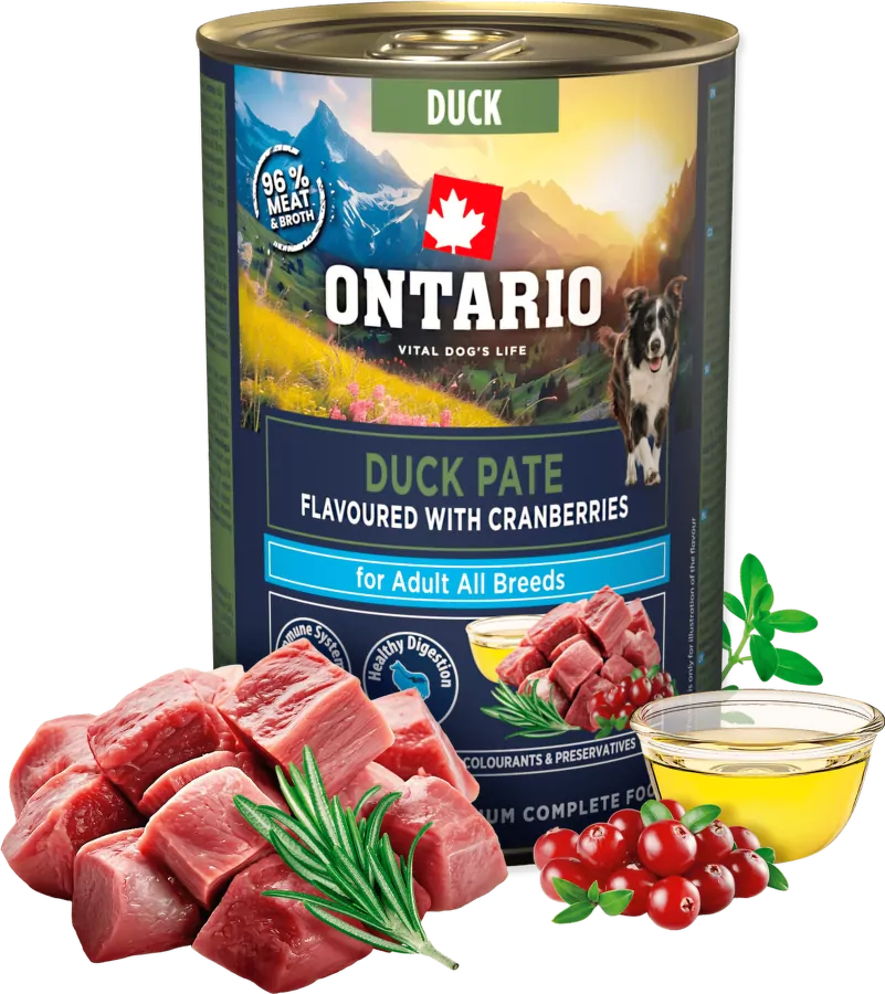 Konzerva Ontario Adult kachní pate s brusinkami. Svaly a podpora močových cest.