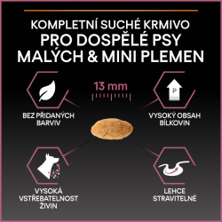 Krmivo Purina PRO PLAN® Sensitive Skin SMALL&MINI ADULT bylo vyvinuto pro dospělé psy malých a trpasličích plemen (s hmotností do 10 kg). Granule obsahují vitamín D, minerální látky a specifické množství omega-3 mastných kyselin (0,8 %), které přispívají ke zdraví zubů a dásní. Krmivo má vysoký podíl lososa, a tak zajišťuje optimální výživu malých a trpasličích plemen od 12 měsíců až do 9 let. Následně byste měli přejít na produkty z řady Age Defence.
