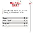 Nutriční doplňkové látky: Vitamín D3: 310 mj., Vitamín E: 105 mg, Vitamín C: 85 mg, Taurin: 1,1 g, Tryptofan: 1,4 g, Železo (3b103): 7 mg, Jód (3b202): 0,3 mg, Měď (3b405, 3b406): 2 mg, Mangan (3b502, 3b503, 3b504): 2 mg, Zinek (3b603, 3b605, 3b606): 20 mg - Senzorické doplňkové látky: Aromata.