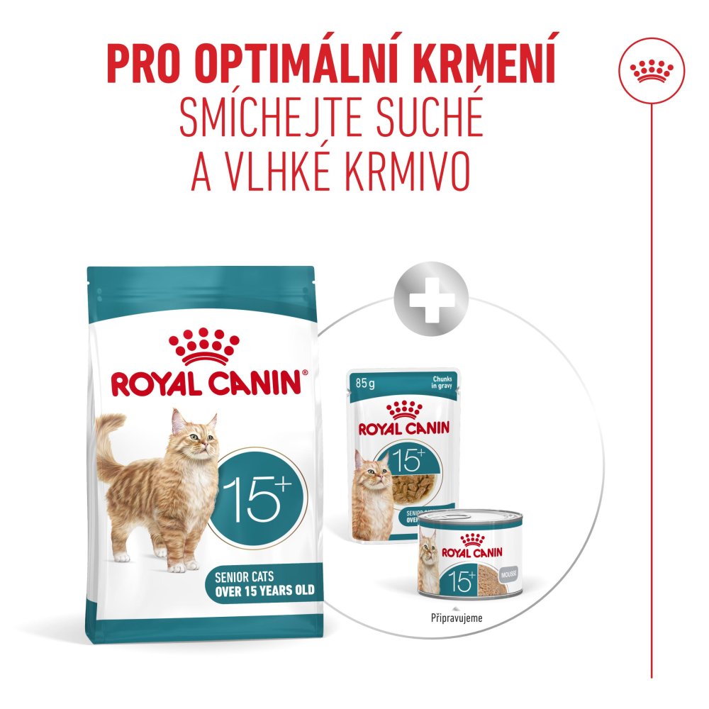 Když kočky dosáhnou věku 15 let a více, jejich zdravotní a životní potřeby se dále vyvíjejí, což vyžaduje specializovaný přístup ke každodenní výživě. Rozpoznání a přizpůsobení se těmto změnám je nezbytné pro podporu zdraví v jejich zlatém věku. ROYAL CANIN® Ageing 15+ je suché granulované krmivo vhodné pro kočky starší 15 let. Toto složení nabízí přesně vyváženou směs živin, které pomáhají přizpůsobit se pokročilému věku vaší kočky. Krmivo ROYAL CANIN® Ageing 15+, které bylo navrženo pro starší kočky, obsahuje snadno stravitelné granule, které vaší kočce poskytnou příjemný zážitek z jídla. Toto složení také obsahuje zvýšené chutné látky pro vylepšenou chuť a čich. Toto složení s naším HealthyAge7™ Advanced Complex poskytuje přesnou nutriční směs navrženou tak, aby pomohla udržet sedm klíčových aspektů zdraví a vitality u koček starších 15 let.