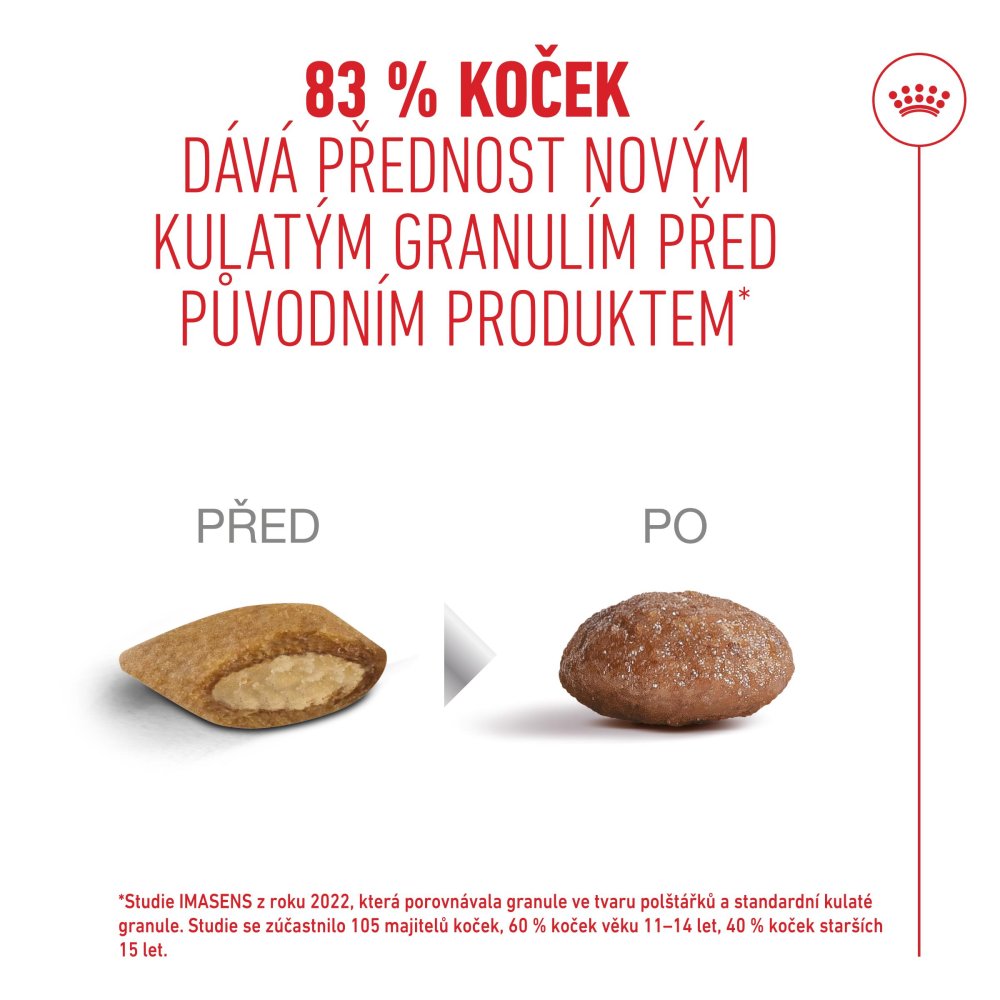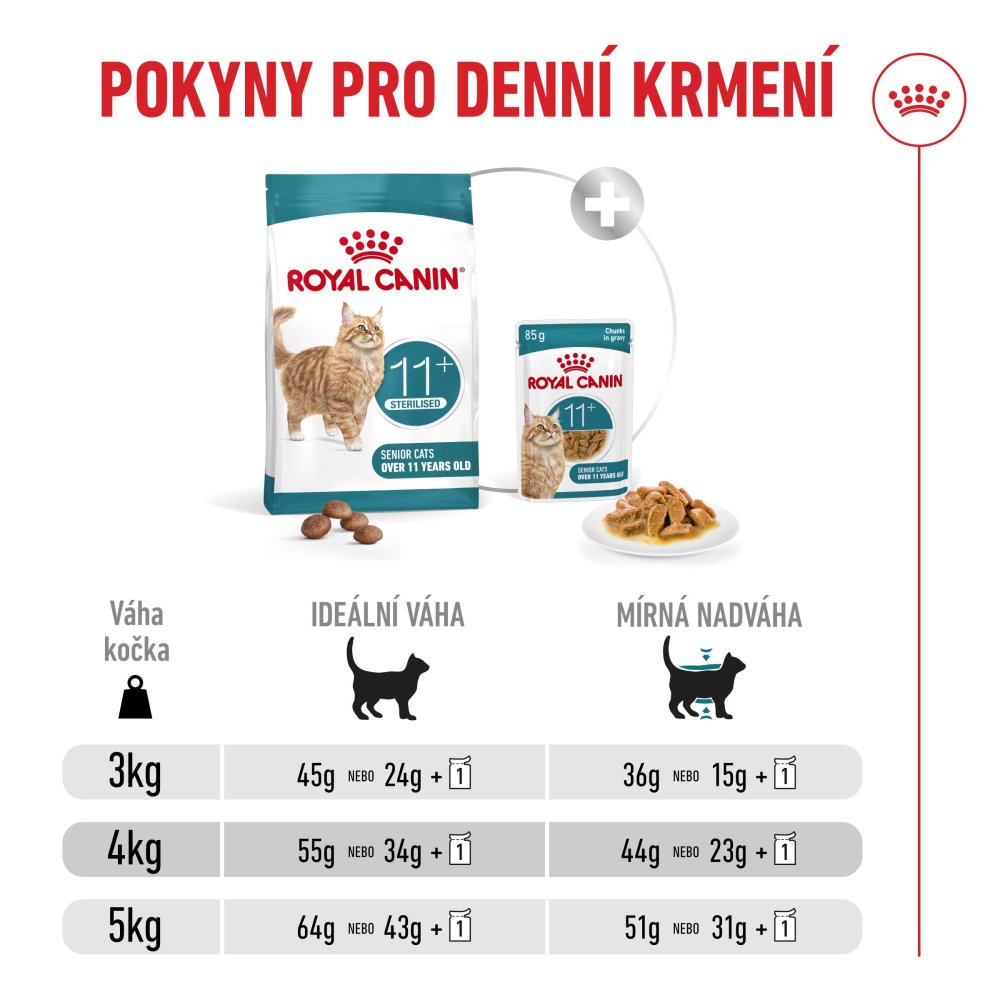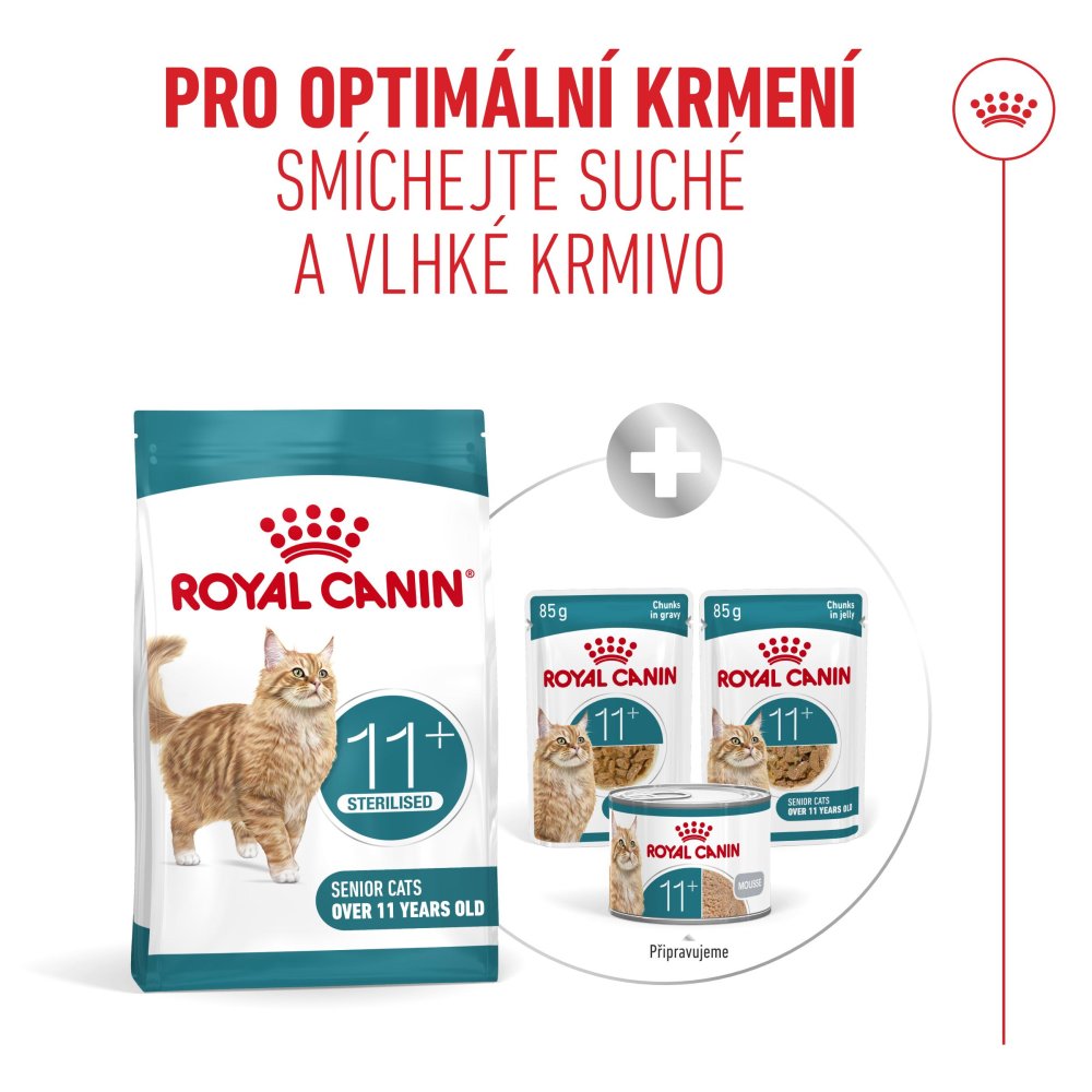 Když kočky vstupují do seniorského věku, přibližně ve věku 10+ let, jejich životní styl a zdravotní potřeby se začínají měnit. Včasné rozpoznání těchto změn může pomoci udržet jejich pohodu a kvalitu života s přibývajícím věkem. ROYAL CANIN® Ageing 11+ Sterilised je suché granulované krmivo vhodné pro sterilizované kočky ve věku 11 let a starší. Toto složení nabízí přesně vyváženou směs živin, které pomáhají udržovat jejich zdraví a vitalitu ve stáří. ROYAL CANIN® Ageing 11+ Sterilised je navržené pro starší kočky a testované na nich Obsahuje snadno stravitelné granule, které vaší kočce poskytnou příjemný zážitek z jídla. Složení s naším komplexem HealthyAge7™ poskytuje přesnou směs živin, která pomáhá udržovat sedm klíčových aspektů zdraví a vitality koček starších 11 let.