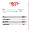 Protein: 30,0 % - Hrubá vláknina: 4,2 % - Obsah tuku: 12,5 % - Hrubý popel: 5,8 % - Kyselina linolová: 3,7 % - Fosfor: 0,6 % - EPA+DHA: 0,6 % - Beta-karoten: 15 mg/kg - Lykopen: 7 mg/kg - Metabolizovatelná energie: 3783 kcal/kg.