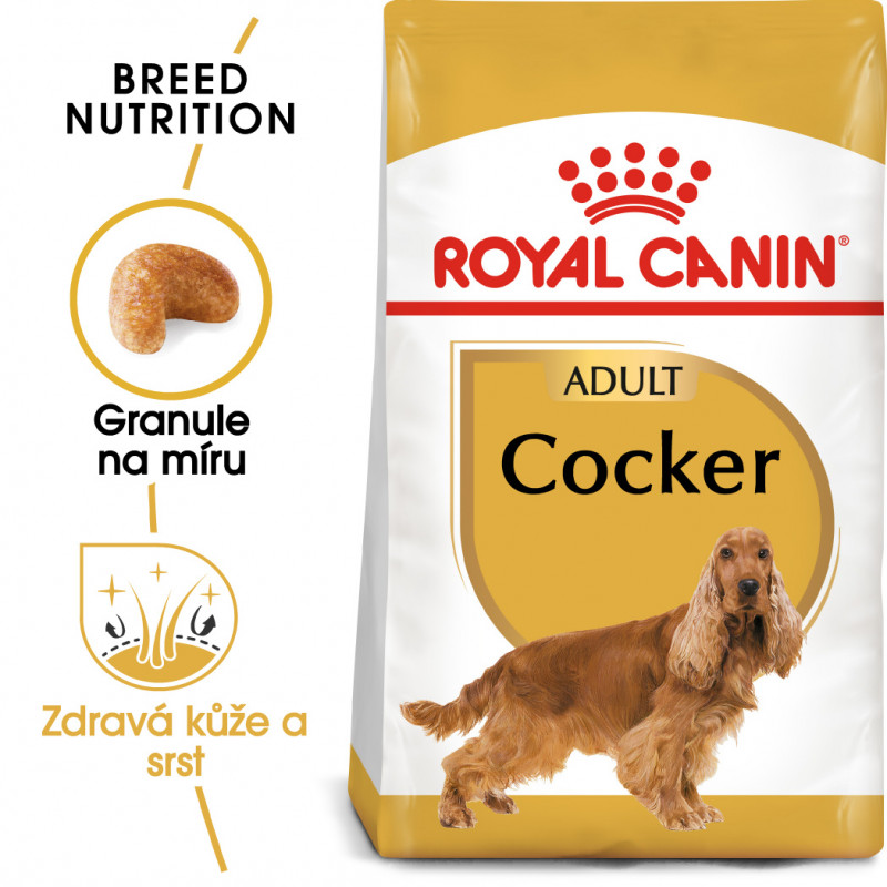 Royal Canin Cocker Adult je kompletní super prémiové krmivo pro dospělé (od 12 měsíců věku) čistokrevné plemeno Kokršpaněl. Speciální krmivo Cocker bylo vyvinuto na míru kokršpanělům, snižuje tendenci tohoto plemene k obezitě, uklidňuje podráždění pokožky a uší díky obsahu mastných kyselin EPA a DHA a olej z brutnáku lékařského dodává srsti přirozenou krásu. Exkluzivní složení s luteinem, zeaxantinem, vitamíny E a C podporuje antioxidační ochranu oka a celkově pozitivně přispívá k dosažení optimálního fungování srdečního svalu.