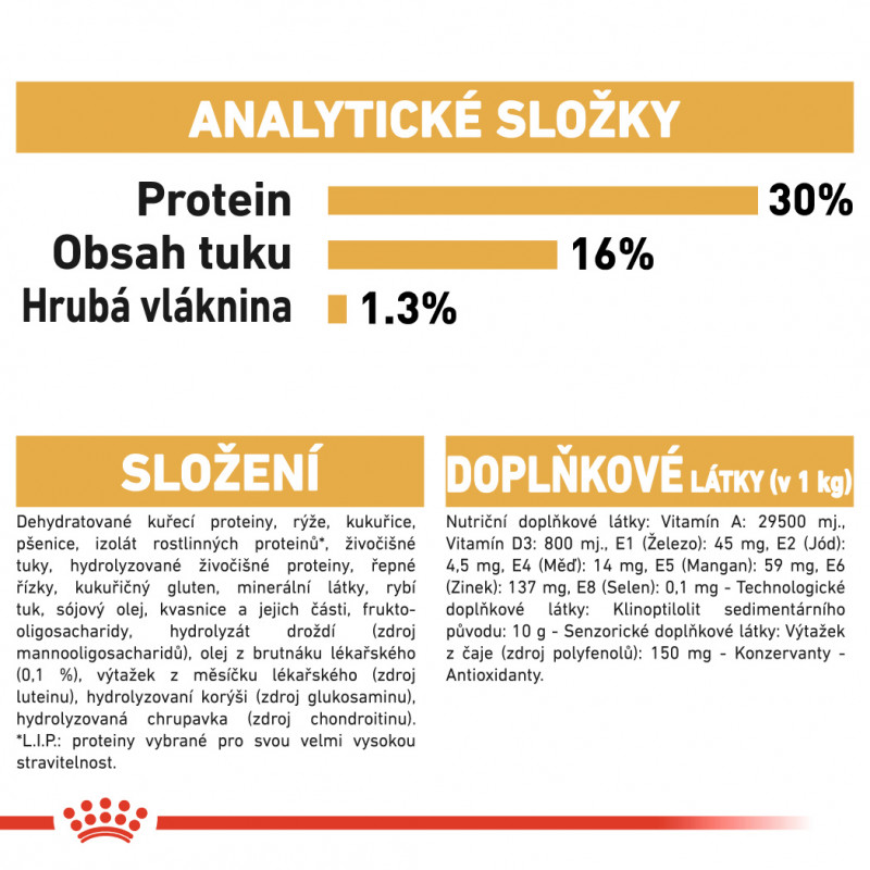 Dehydratované drůbeží maso, rýže, kukuřice, pšenice, izolát rostlinného proteinu (L.I.P. protein vybraný díky své vysoké stravitelnosti), živočišné tuky, hydrolyzované živočišné proteiny, řepné řízky, kukuřičný lepek, minerály, rybí olej, sójový olej, kvasnice, fruktooligosacharidy, hydrolyzované kvasnice (zdroj mannooligosacharidu), olej z brutnáku lékařského (0,1 %), výtažek z měsíčku lékařského (zdroj luteinu), hydrolyzovaní korýši (zdroj glukosaminu), hydrolyzované chrupavky (zdroj chondroitinu)