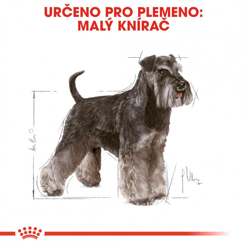 Royal Canin Miniature Schnauzer Adult je kompletní super prémiové krmivo pro dospělé (od 10 měsíců věku) čistokrevné plemeno malého knírače. Krmivo Miniature Schnauzer vám bude s bojem proti možným nemocím odborným pomocníkem. Přispívá totiž k udržení zdravého močového systému vašeho psa. Vyvážené složení také pomáhá udržovat tělesnou hmotnost malých kníračů. Obsah specifických aminokyselin podporuje zachování přirozeného zbarvení srsti a exkluzivní tvar granule omezuje tvorbu zubního kamene pomocí obsahu polyfosfátů sodíku, které zachycují vápník ve slinách. Na míru strukturovaná granule mechanicky očisťuje chrup.