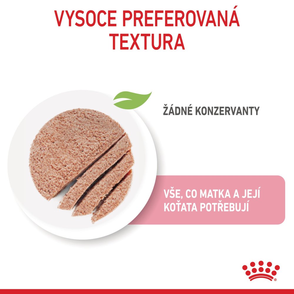 Během prvních 3 týdnů se koťata spoléhají na mateřské mléko. Od té doby začnou odstavená koťata přecházet na olizování a žvýkání toho, co jejich matka jí. Z tohoto důvodu je dobré krmit březí a kojící matky výživnou stravou, která je přizpůsobena tak, aby vyhovovala jejím jedinečným nutričním potřebám a potřebám jejích koťat. Pěna ROYAL CANIN® Mother & Babycat Ultra Soft Mousse je speciálně upravena tak, aby vyhovovala vysokým energetickým potřebám vaší kočky na konci březosti a během laktace. Je také formulován tak, aby měl chutnou, měkkou texturu, která je ideální pro kojící koťata do 4 měsíců. Novorozená koťata dostávají ochranné protilátky z mleziva své matky, ale tato ochrana časem slábne. ROYAL CANIN® Mother & Babycat Ultra Soft Mousse obsahuje osvědčený komplex včetně vitamínů C a E pro podporu zdravého vývoje imunitního systému. Tato receptura je obohacena o omega-3 mastné kyseliny (DHA) pro podporu vývoje mozku a zdravého zraku u malých koťat. Díky kombinaci prospěšných prebiotik (MOS) a vysoce stravitelných bílkovin pomáhá ROYAL CANIN® Mother & Babycat Ultra Soft Mousse také podporovat zdravou rovnováhu střevní mikrobioty (střevní flóry) pro dobré trávení. Krmivo ROYAL CANIN® Mother & Babycat Ultra Soft Mousse je nejen snadné pro koťata, která se odstavují, ale také pomáhá kojící matce poskytnout vláhu, kterou potřebuje pro produkci mléka. Věděli jste, že nutriční potřeby kotěte se mění, jak roste? V krátkém období 16 týdnů budou potřebovat stravu, která je speciálně upravena tak, aby vyhovovala jejich nutričním potřebám během další růstové fáze. V této fázi je můžete převést na dietu ROYAL CANIN® pro koťata. Jsou k dispozici jako suché granule nebo jako mokré kousky v bochníku, omáčce nebo želé. V Royal Canin jsme odhodláni vytvářet lepší svět pro kočky a psy. Již více než 50 let úzce spolupracujeme s chovateli, veterináři a odborníky na domácí mazlíčky, sdílíme odborné znalosti a vědecký výzkum, abychom vytvořili specializovaný přístup k individualizovaným a přesným výživovým řešením. Všechny naše produkty procházejí rozsáhlým procesem kontroly kvality, aby byla zaručena optimální kvalita potravin. Když vaše královna a její koťata jedí ROYAL CANIN® Mother & Babycat Ultra Soft Mousse, dostávají kompletní a vyváženou stravu.