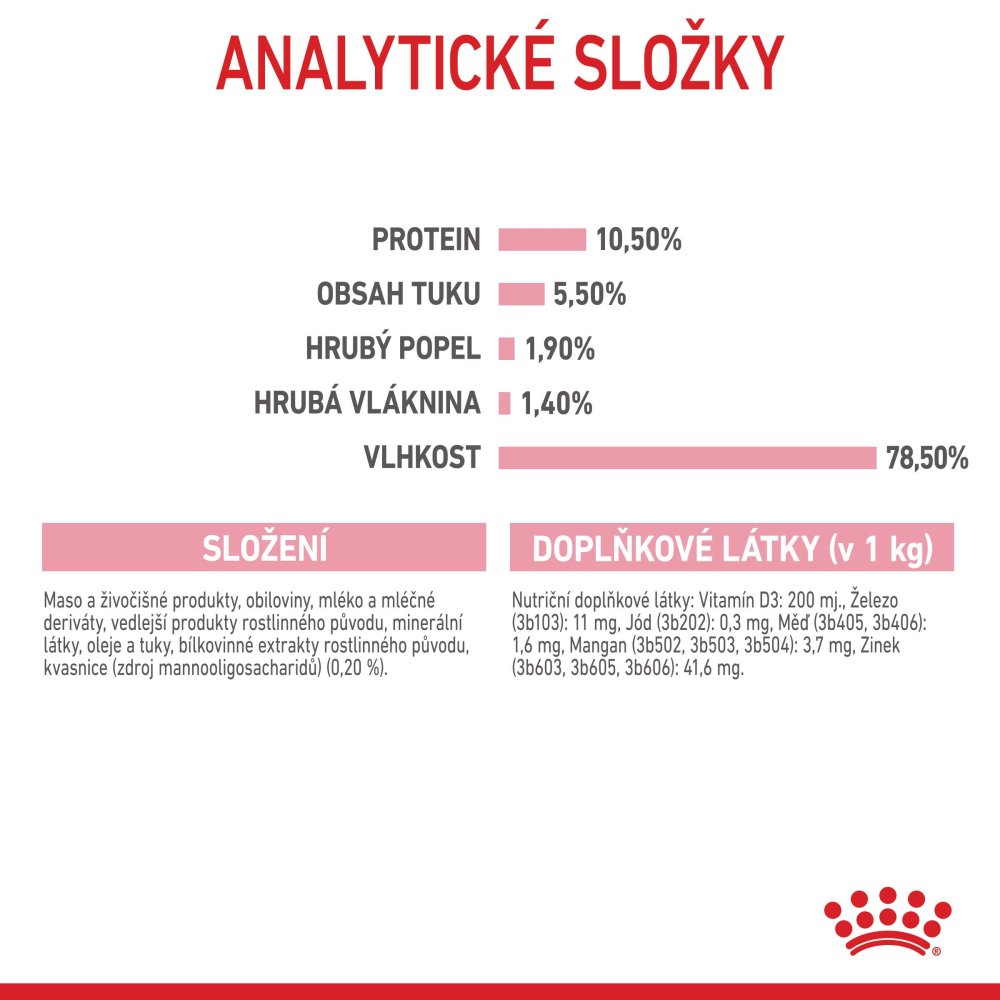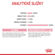 ANALYTICKÉ SLOŽKY: Protein: 10,0 % - Hrubá vláknina: 1,3 % - Obsah tuku: 4,3 % - Hrubý popel: 1,5 % - Vlhkost: 78,0 % - Metabolizovatelná energie: 939 kcal/kg.