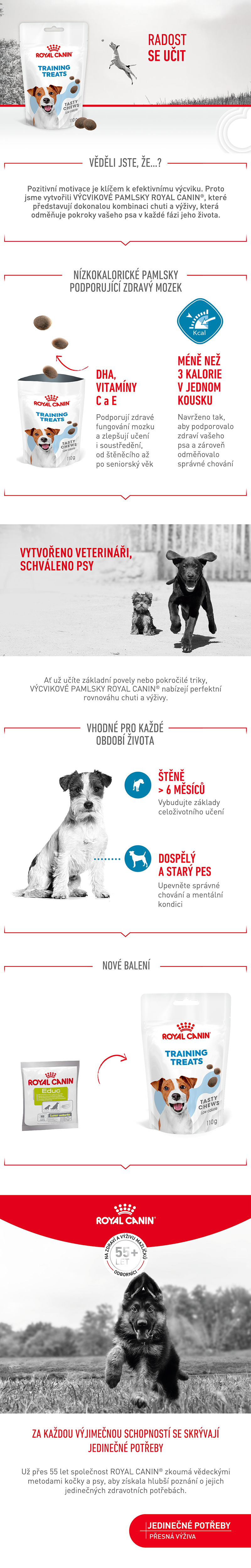 Klíčem k efektivnímu tréninku je pozitivní motivace. Proto jsme vytvořili ROYAL CANIN® TRAINING TREATS, dokonalou rovnováhu chuti a výživy navrženou tak, aby odměňovala pokroky vašeho psa v každé fázi života.