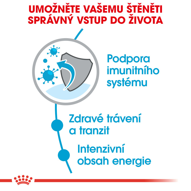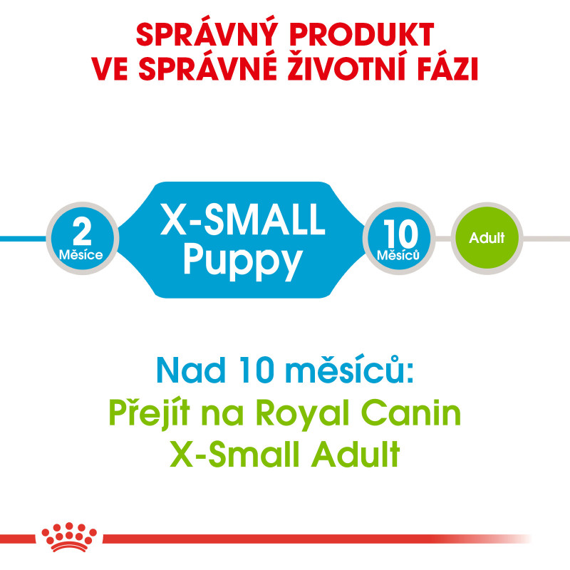 Krmivo ROYAL CANIN® X-Small Puppy je vhodné pro štěňata velmi malých plemen od 2 do 10 měsíců. Mezi velmi malá se řadí plemena psů, kteří dosahují váhy do 4 kg. Malí psi se většinou dožívají vyššího věku než velcí psi, ale dospělosti dosahují dříve. To znamená, že vaše malé štěně potřebuje to správné množství energie, aby se vyvíjel jeho imunitní systém. Ten se vyvíjí postupně, i když jeho tělo roste rychle.