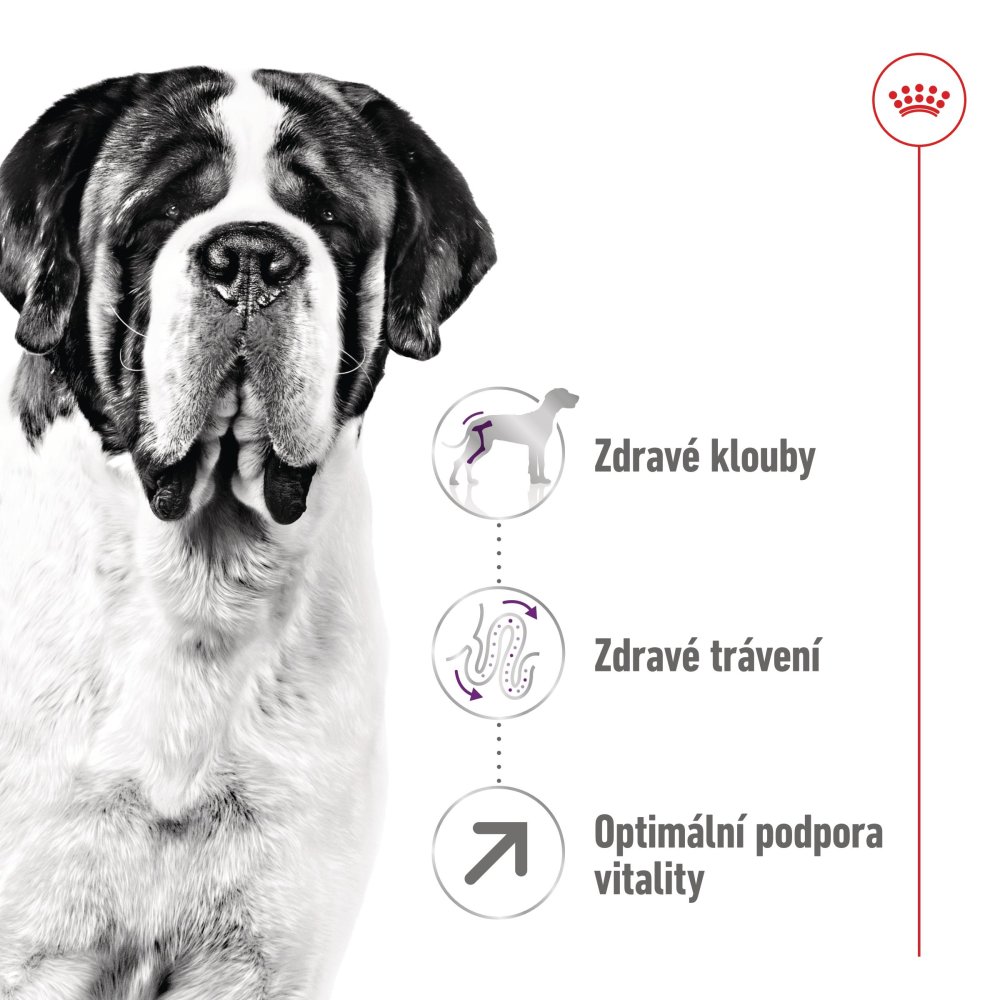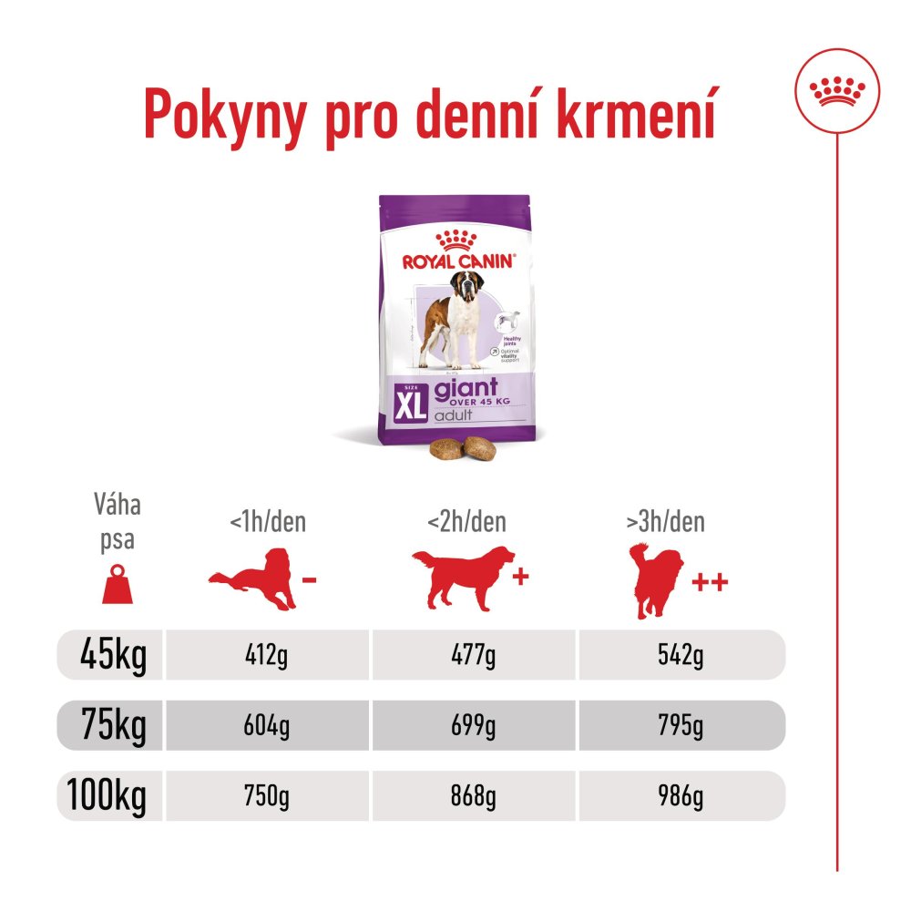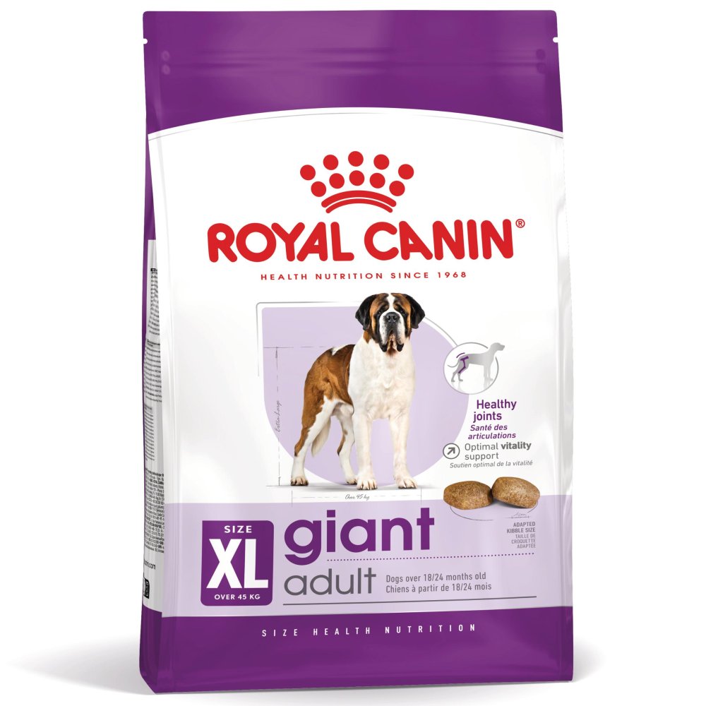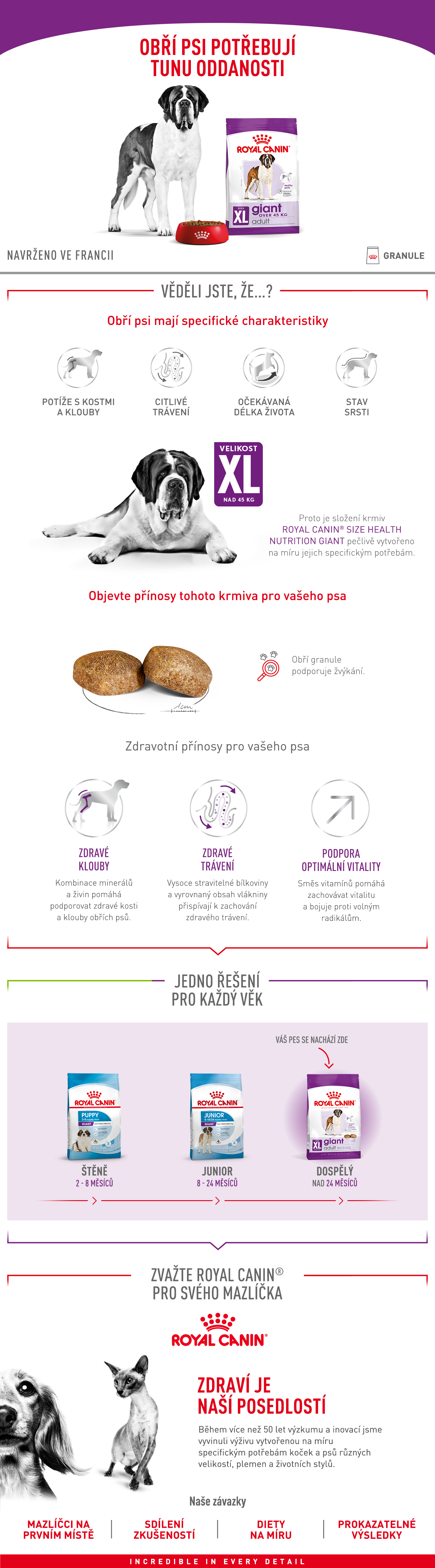 Tito obří psi okouzlují lidi svou vznešenou postavou. Jejich srdce je stejně velké jako jejich podoba. Jsou proslulí svou jemnou a ušlechtilou povahou. Svým majitelům jsou velmi věrní a všude, kam se vydají, působí odvážným dojmem. To však znamená, že potřebují stravu speciálně přizpůsobenou jejich velikosti, aby se podpořily jejich jedinečné nutriční požadavky. ROYAL CANIN® Giant Adult je nutričně kompletní a vyvážená receptura speciálně navržená tak, aby splňovala specifické potřeby vašeho obřího psa a podporovala ho po celou dobu jeho dospělosti. Toto krmivo je vhodné pro psy extra velkých psů, kteří váží více než 45 kg a jsou starší 18 nebo 24 měsíců. Obrovská velikost a aktivní povaha obřích psů může znamenat značnou zátěž pro jejich klouby. Naše jedinečná směs minerálů a živin je přizpůsobena tak, aby pomohla podpořit kosti a klouby vašeho obřího psa. Obří psi, kteří mají delší dobu trávení, jsou ve srovnání s menšími plemeny náchylnější k zažívacím potížím. Tato receptura s vysoce stravitelnými proteiny a přesně odměřenou vlákninou udržuje zdraví trávicího traktu. Váš extra velký pes potřebuje speciální živiny, aby byl v dospělosti vitální, aktivní a dobře prospíval. Tato receptura je obohacena o pečlivě vybranou směs vitamínů, která pomáhá neutralizovat volné radikály a podporuje vitalitu vašeho psa. Vzhledem k širokým čelistem obřích psů je důležité přizpůsobit se jejich jedinečným stravovacím návykům. Tato speciální, extra velká granule je přizpůsobena čelistem vašeho psa a její tvar ho podporuje v důkladném žvýkání potravy. Všechny výrobky ROYAL CANIN® procházejí rozsáhlým procesem kontroly kvality, který zaručuje vysoce kvalitní krmivo. Náš tým vědců vytváří receptury šité na míru specifickým výživovým potřebám vašeho obřího psa s použitím vysoce kvalitních živin a s ohledem na životní prostředí.